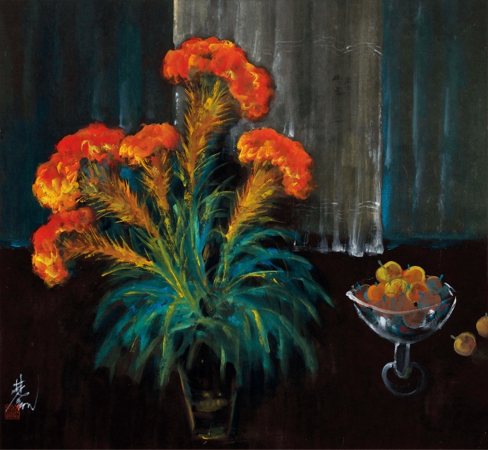 关良是融汇中西绘画的大师,静物也是他重视的题材,《月季花瓶图》吸取了油画的笔触和塑造方式,色彩单纯绚烂,融入了墨色和环境色。花瓶与花朵矗立正中,展示出怒放的生命力,背后的窗外,则是生机盎然的绿色和希望。