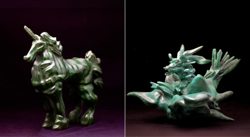 中国台湾当代艺术家杨占的"神兽系列"青铜雕塑作品《独角兽王后》(左)与《重生水龙》(右)。(图:杨占)