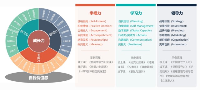 基于十年女性成长研究,社区重磅推出“梧桐成长力模型”,以“自我价值感”为根基,构建学习力、幸福力、领导力三大能力支柱——学习力聚焦持续学习与环境适应能力,领导力侧重组织协调团队达成共同目标的能力,幸福力则强调在奋斗中兼顾幸福感与生命活力,总共包含18项核心素养。该模型整合积极心理学、管理学、社会学、女性发展、脑科学等跨学科理论成果,如借鉴班杜拉自我效能理论、马斯洛需求层次理论,结合中国女性生存现状和痛点问题,形成可量化、可进阶的能力体系。