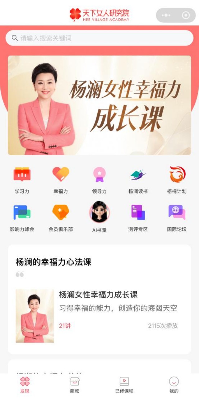 同步升级的“天下女人学苑”小程序,实现“测评-学习-社群-服务”全流程线上化。用户可通过小程序: