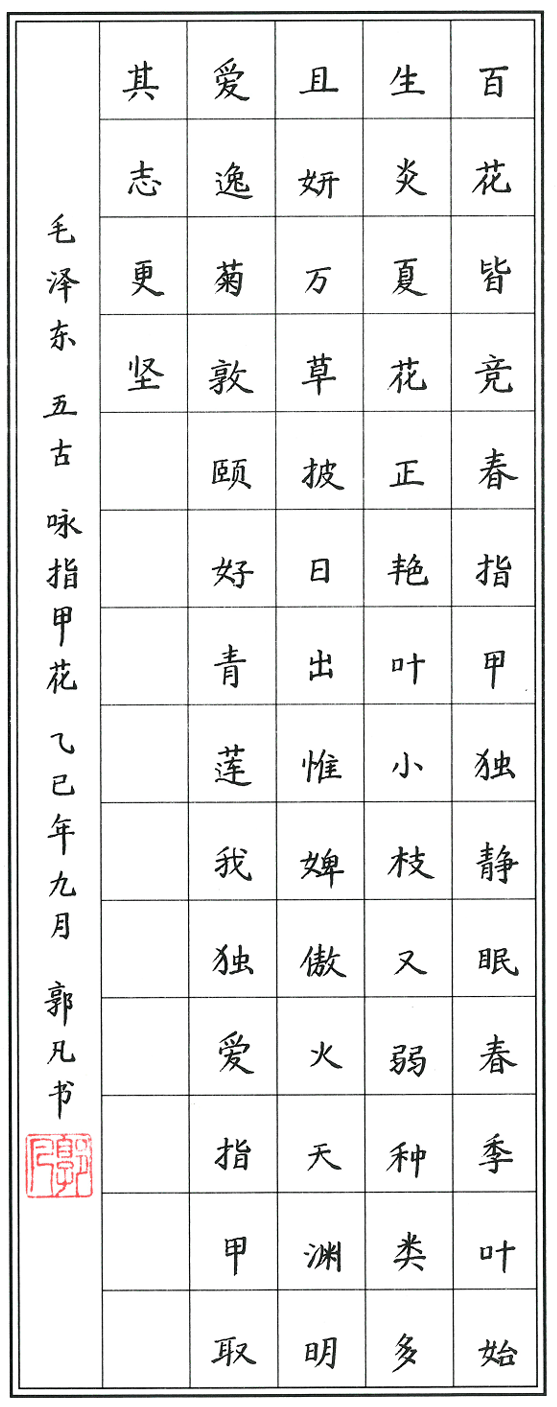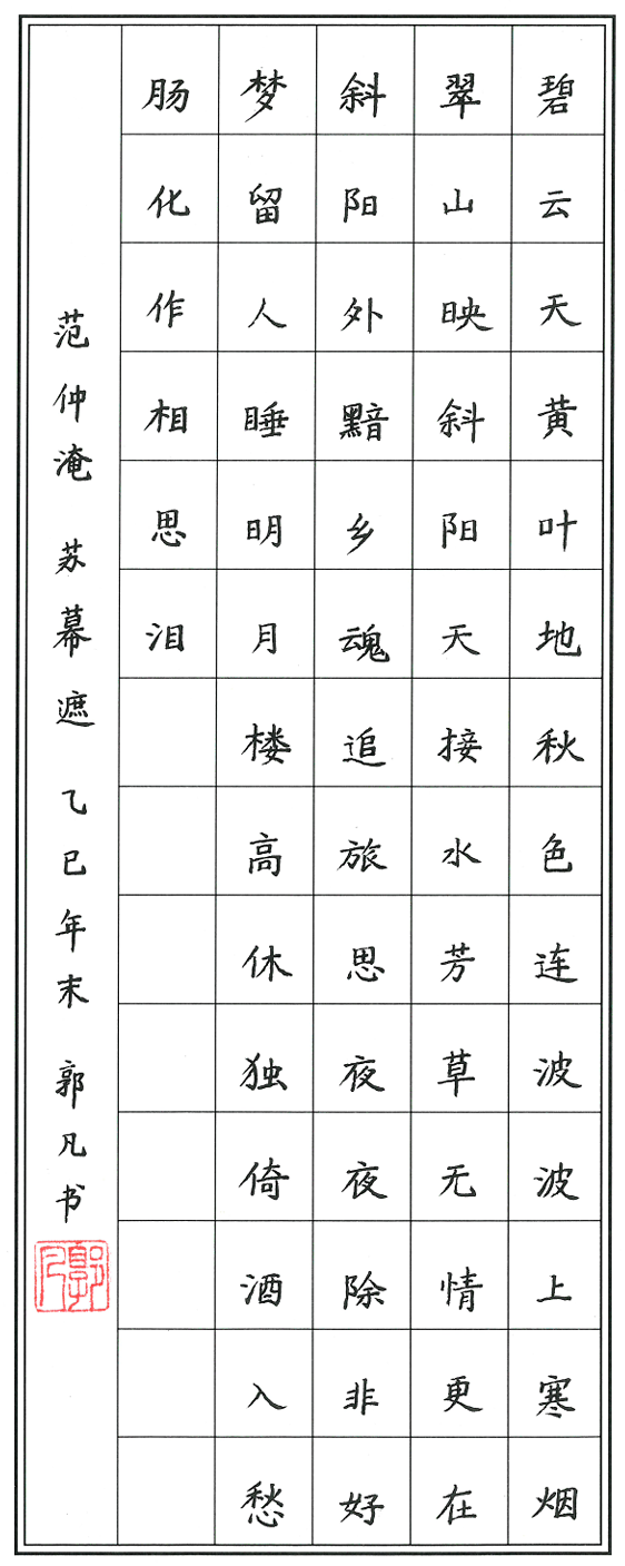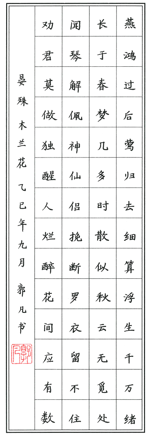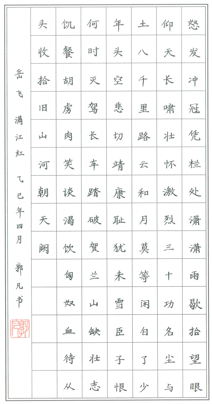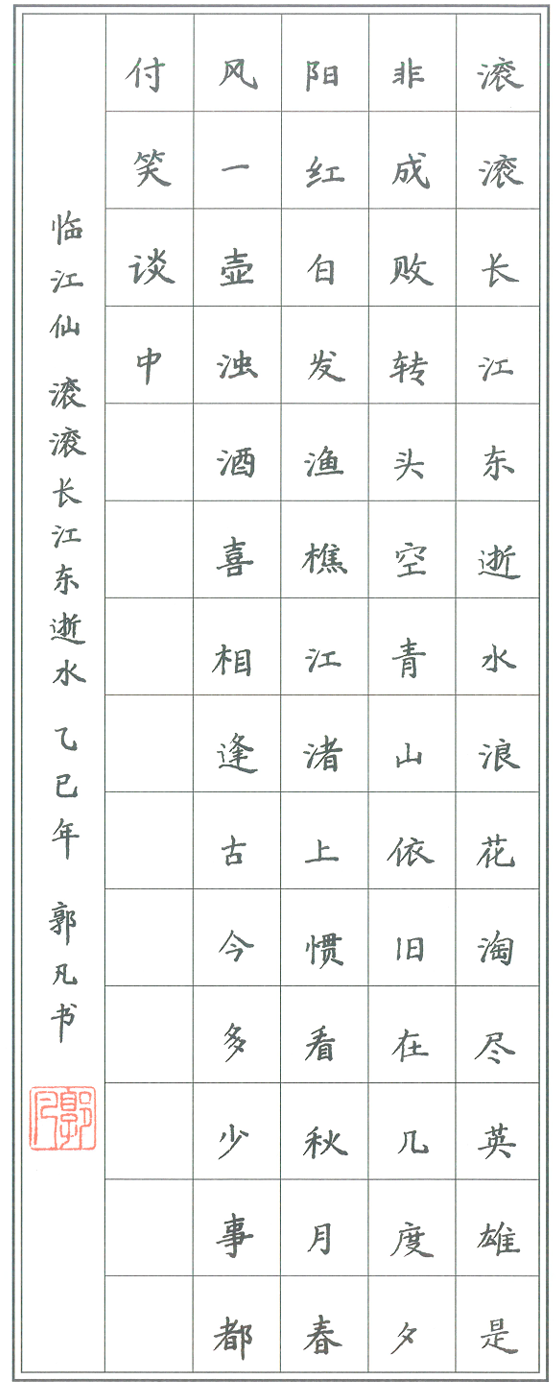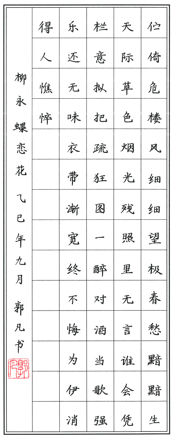 郭凡 男 1961年生人。香港中国书法家协会荣誉主席。2004年10月在“十月赞歌——庆祝祖国五十五华诞全国书画摄影艺术邀请赛”上获硬笔金奖。2005年在“兰花杯”第二届全国青少年书画段位大赛上获硬笔一等奖,并授予八段艺术段位。2006年入选《中华传世书画鉴赏》一书并获硬笔“传世金奖”。2009年在《中国艺术家大典》征稿评选活动中荣获硬笔书法金奖。2010年在由中国美术教育委员会和中国书画摄影家协会举办的“黄山杯第十八届中国当代书画名家作品邀请赛”上获硬笔书法金奖。2011年荣获“名家名作”中国书画家优秀作品邀请赛硬笔金奖。2011年在第十九届“母亲颂”全国书画摄影作品大赛中获硬笔金奖。2013年在第二十三届“中华杯”全国书画摄影大展中获硬笔金奖。2013年在“滕王阁杯”中国南昌第9届文学艺术大奖赛中获硬笔书法一等奖。2013年七月在“墨舞中华·第一届全国书画家作品邀请赛”中获硬笔金奖。2014年在第十二届“阳光杯”全国书画摄影大赛中获硬笔书法金奖。2015年在全国第11届“滕王阁杯”文学艺术大赛中获硬笔书法一等奖。2015年在“黄山杯”全国书画摄影大展赛中荣获金奖。2017年在“艺海杯”全国书画摄影大展赛中荣获硬笔金奖。2021年在香港中国书法家协会举办的第十五届“中国艺术家作品邀请展”评比大赛中荣获第一名。