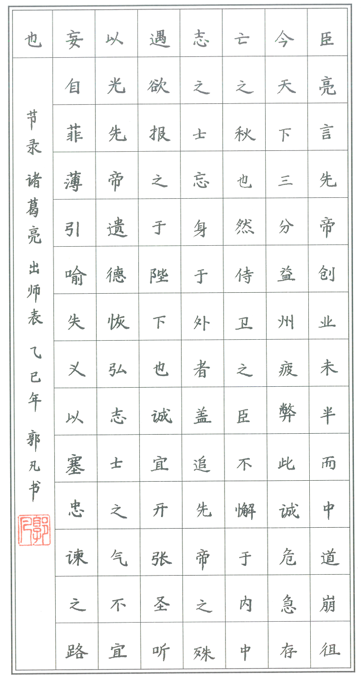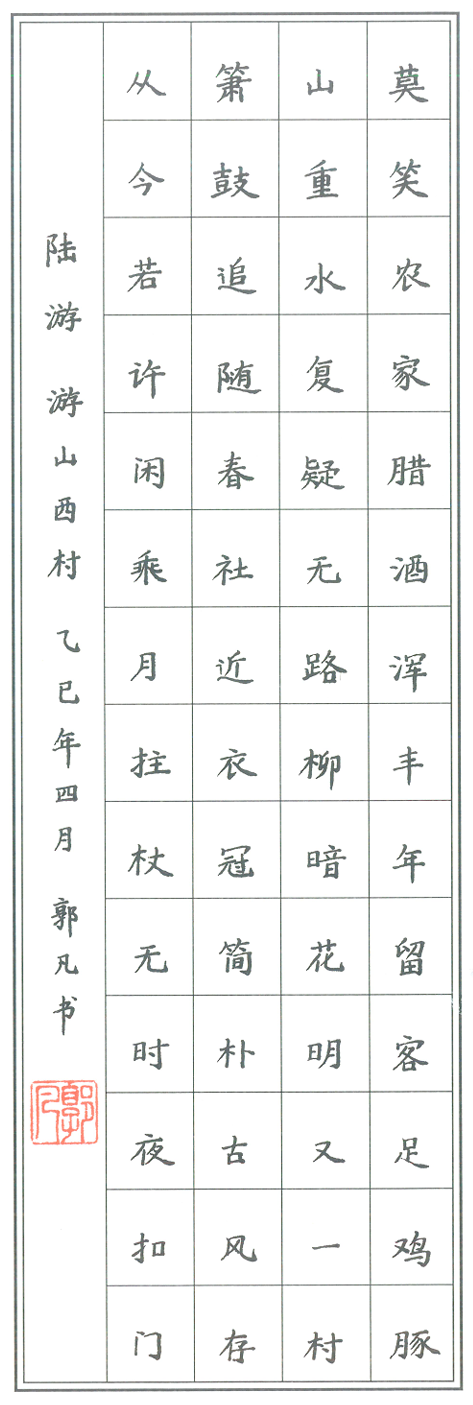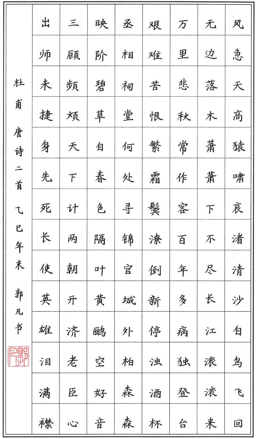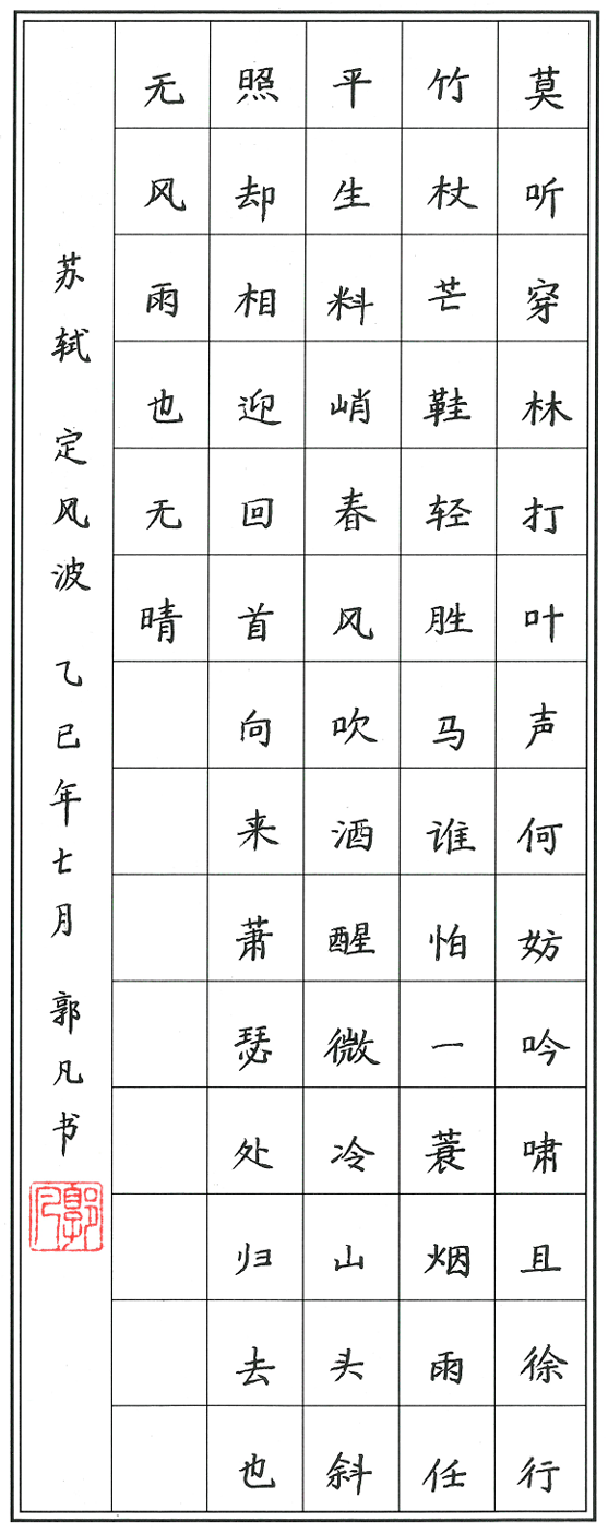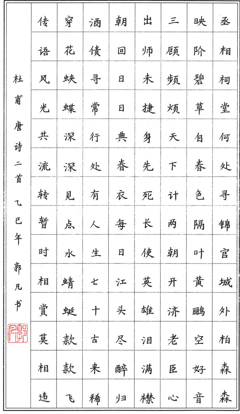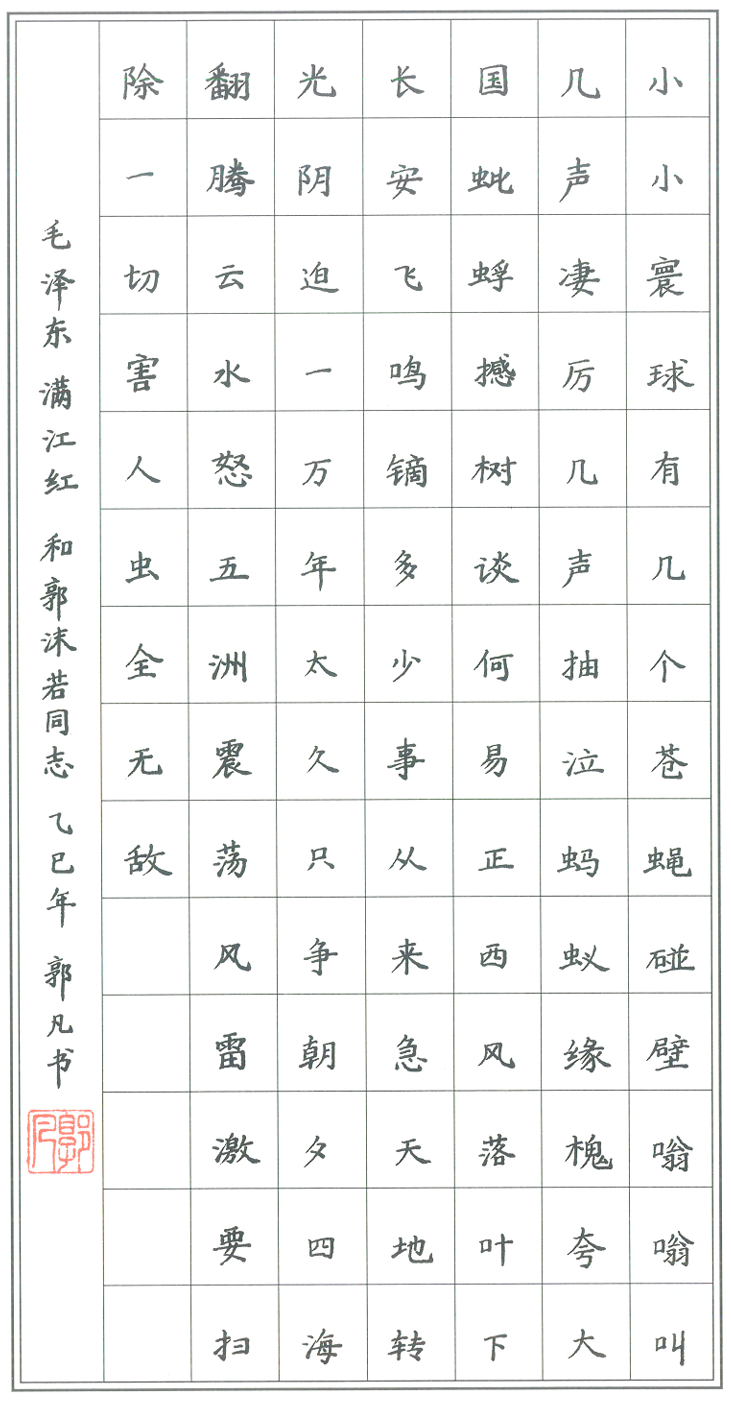 郭凡 男 1961年生人。香港中国书法家协会荣誉主席。2004年10月在“十月赞歌——庆祝祖国五十五华诞全国书画摄影艺术邀请赛”上获硬笔金奖。2005年在“兰花杯”第二届全国青少年书画段位大赛上获硬笔一等奖,并授予八段艺术段位。2006年入选《中华传世书画鉴赏》一书并获硬笔“传世金奖”。2009年在《中国艺术家大典》征稿评选活动中荣获硬笔书法金奖。2010年在由中国美术教育委员会和中国书画摄影家协会举办的“黄山杯第十八届中国当代书画名家作品邀请赛”上获硬笔书法金奖。2011年荣获“名家名作”中国书画家优秀作品邀请赛硬笔金奖。2011年在第十九届“母亲颂”全国书画摄影作品大赛中获硬笔金奖。2013年在第二十三届“中华杯”全国书画摄影大展中获硬笔金奖。2013年在“滕王阁杯”中国南昌第9届文学艺术大奖赛中获硬笔书法一等奖。2013年七月在“墨舞中华·第一届全国书画家作品邀请赛”中获硬笔金奖。2014年在第十二届“阳光杯”全国书画摄影大赛中获硬笔书法金奖。2015年在全国第11届“滕王阁杯”文学艺术大赛中获硬笔书法一等奖。2015年在“黄山杯”全国书画摄影大展赛中荣获金奖。2017年在“艺海杯”全国书画摄影大展赛中荣获硬笔金奖。2021年在香港中国书法家协会举办的第十五届“中国艺术家作品邀请展”评比大赛中荣获第一名。