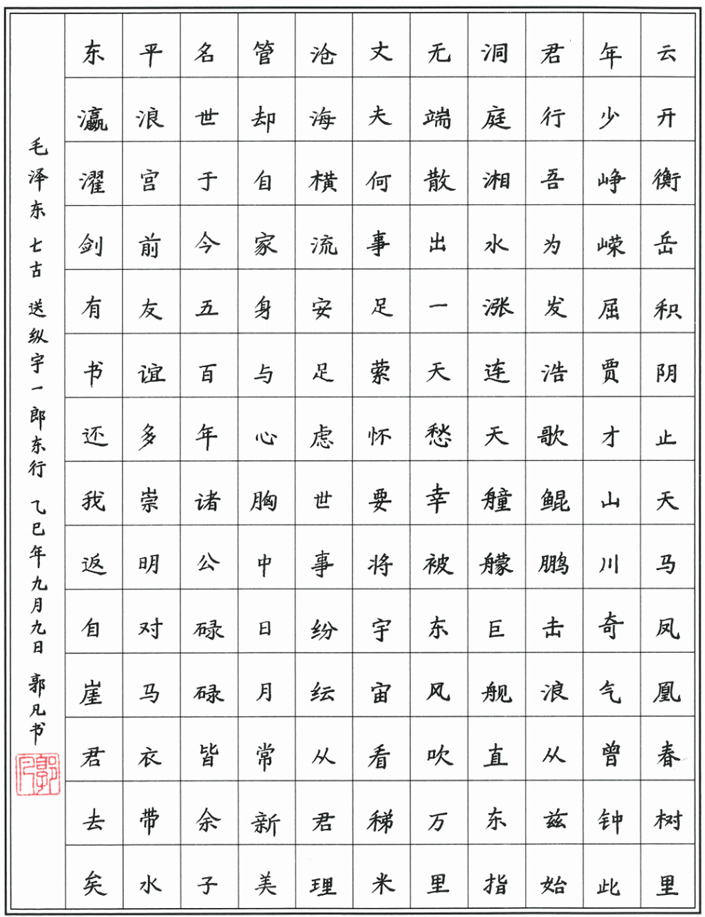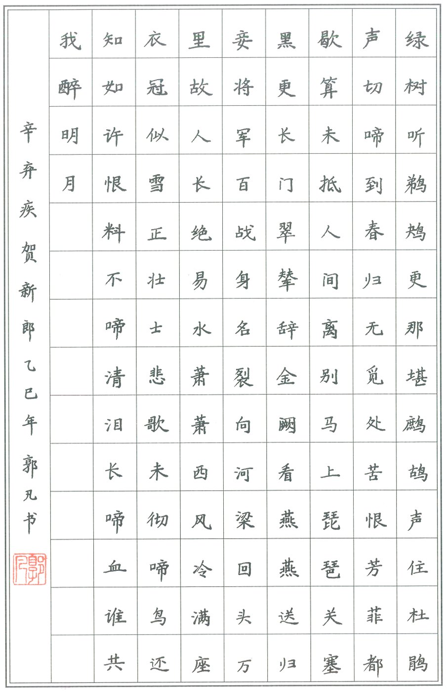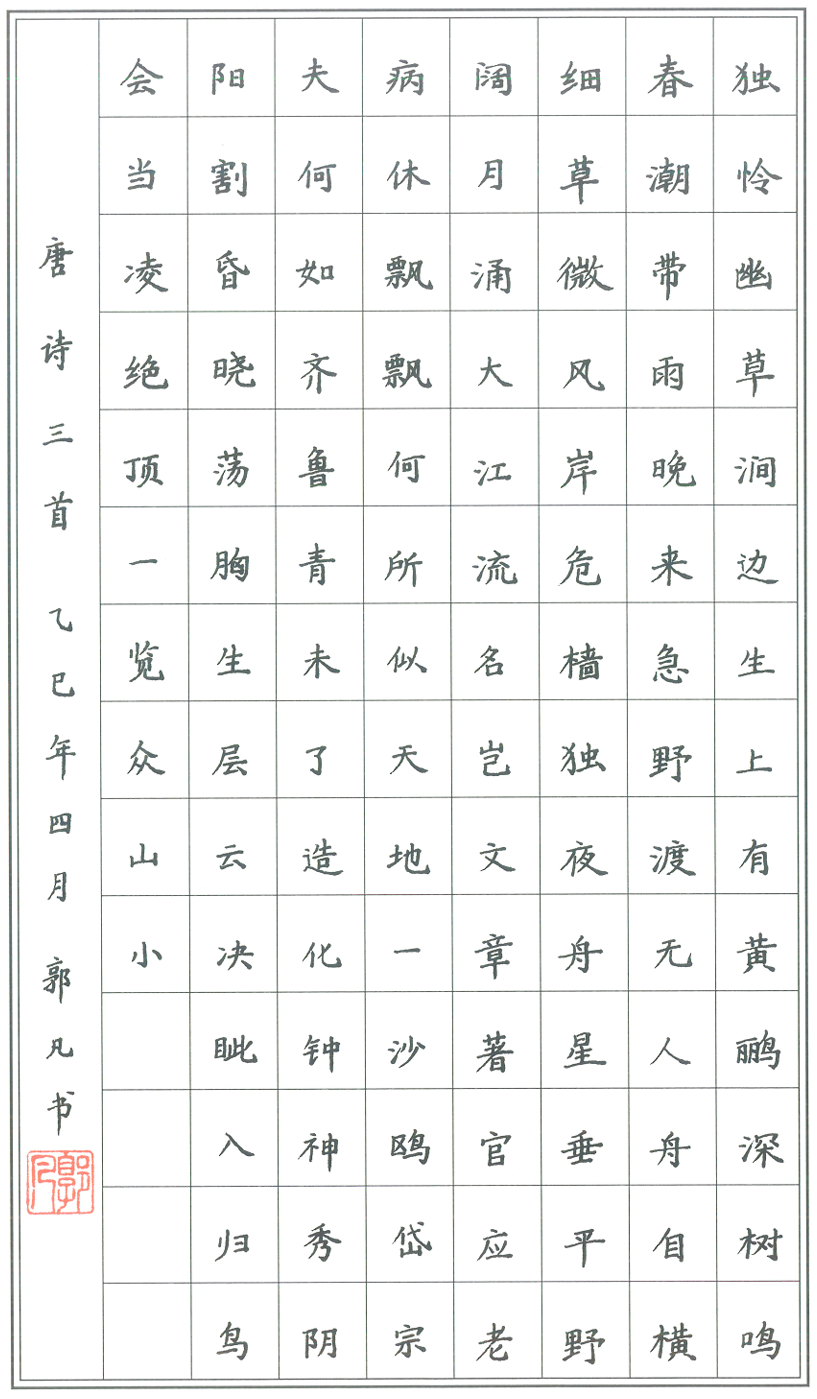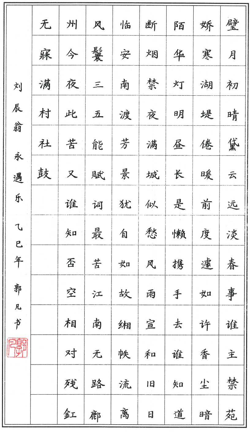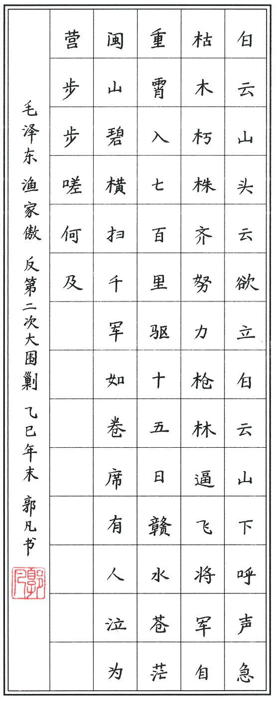 郭凡 男 1961年生人。香港中国书法家协会荣誉主席。2004年10月在“十月赞歌——庆祝祖国五十五华诞全国书画摄影艺术邀请赛”上获硬笔金奖。2005年在“兰花杯”第二届全国青少年书画段位大赛上获硬笔一等奖,并授予八段艺术段位。2006年入选《中华传世书画鉴赏》一书并获硬笔“传世金奖”。2009年在《中国艺术家大典》征稿评选活动中荣获硬笔书法金奖。2010年在由中国美术教育委员会和中国书画摄影家协会举办的“黄山杯第十八届中国当代书画名家作品邀请赛”上获硬笔书法金奖。2011年荣获“名家名作”中国书画家优秀作品邀请赛硬笔金奖。2011年在第十九届“母亲颂”全国书画摄影作品大赛中获硬笔金奖。2013年在第二十三届“中华杯”全国书画摄影大展中获硬笔金奖。2013年在“滕王阁杯”中国南昌第9届文学艺术大奖赛中获硬笔书法一等奖。2013年七月在“墨舞中华·第一届全国书画家作品邀请赛”中获硬笔金奖。2014年在第十二届“阳光杯”全国书画摄影大赛中获硬笔书法金奖。2015年在全国第11届“滕王阁杯”文学艺术大赛中获硬笔书法一等奖。2015年在“黄山杯”全国书画摄影大展赛中荣获金奖。2017年在“艺海杯”全国书画摄影大展赛中荣获硬笔金奖。2021年在香港中国书法家协会举办的第十五届“中国艺术家作品邀请展”评比大赛中荣获第一名。