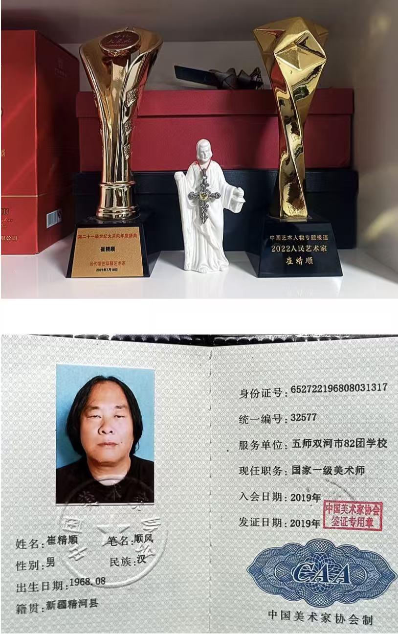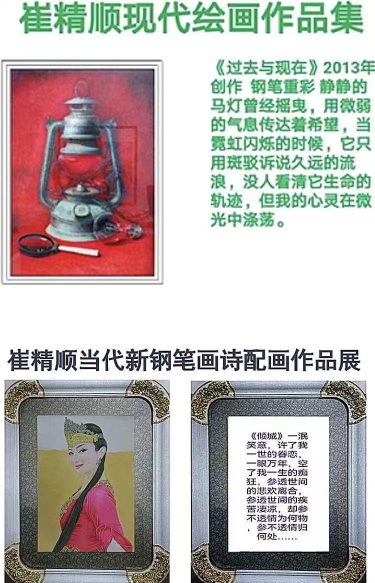 崔精顺,男 ,汉族,1968年生,1996年毕业于新疆教育学院美术专业,2006年毕业于新疆石河子大学本科美术系。新疆兵团美术家协会会员,2019年颁发中国美术家协会会员,没入官网第五师双河市八十三团第二中学美术教师,从事美术教育今年刚好30年本人辅导的学生多次荣获国家级大奖本人从事钢笔画和油笔画研究多年,其作品父亲系列2008年第四期在中国连环画报上刊登,多幅作品被海内外爱好者收藏,2016年受邀参与《向企业重点推荐的书画名家名作》工作,作品受到业内人士一致青睐。