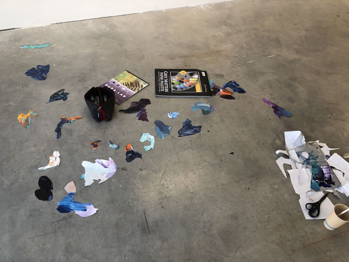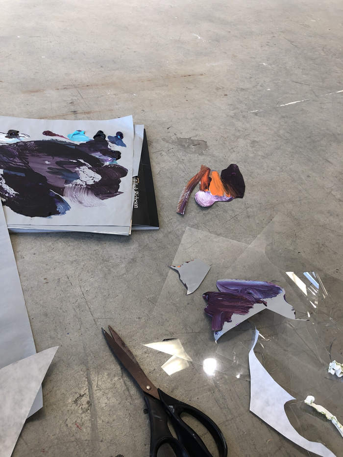 除此之外,他还通过拼贴元素进一步打破作品的边界:调色盘残骸被剪裁为不规则形状,转印复刻的亚克力版在肢解后被嵌入画面……龚若愚形容自己的创作为一种冥想与内观:“脑海中的场景就如同拼贴一样从来不是规则的,它的形状正契合了我的情绪边界。”