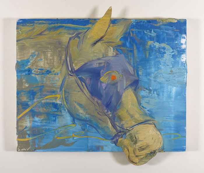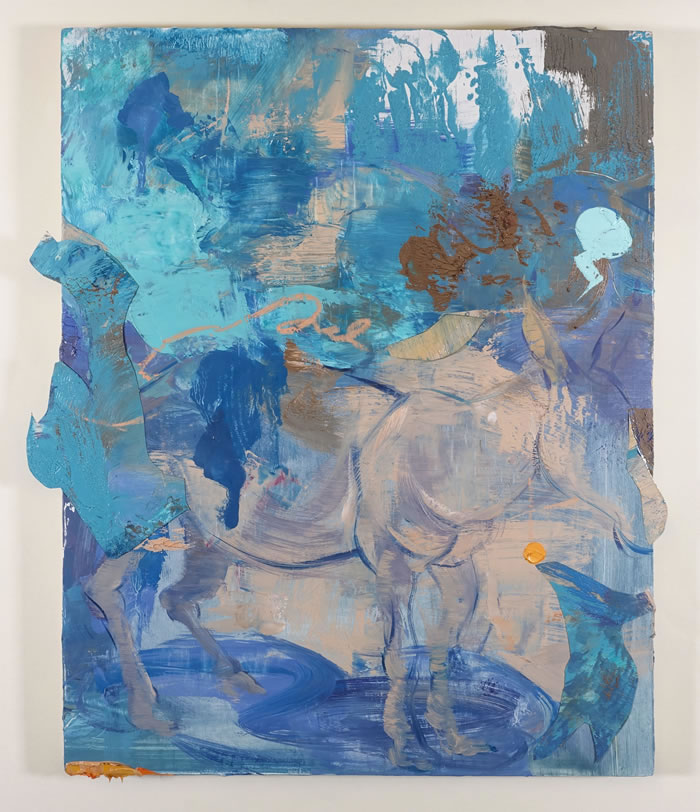 第一次看到龚若愚的画,就被他画面上迸发出的情绪牢牢抓住。那是他2024年底的一系列作品,蓝驴的形象以不同形态出现在画面中,有的脖子上坠着铃铛、有的双眼蒙上眼罩,作品特意突破画框边界进行了雕塑和综合材料的拓展,更加剧了整体的视觉冲击感,似乎隔着屏幕都能听见驴子的嘶吼声。