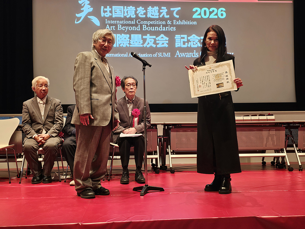 亚洲国际艺术协会理事长吴欐樱专程前往日本接受殊荣,由小林东云会长亲自授予「特别荣誉赏」,表彰她在国际艺术交流与书画推广领域的杰出成就与长期贡献。