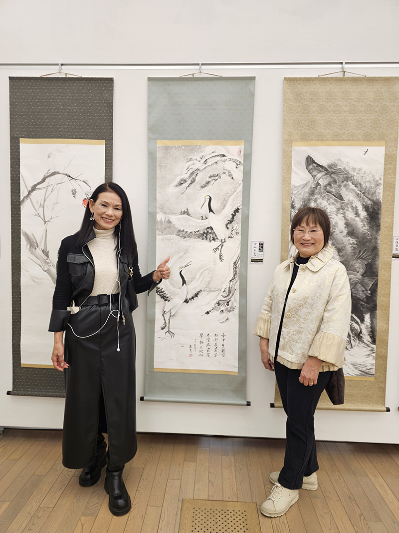 王门傑在阐述创作思维时表示,他将书法、绘画与篆刻融为一体,透过文字表达山水境界,希望观赏者在欣赏画作时,也能阅读其中文字,体会蕴含的文化底蕴。中山玉惠则描绘白鹤与苍松屹立于风雪之间,象征长寿与坚毅。严寒环境中松树挺立不屈,双鹤昂然而立,展现顽强的生命力。她藉此回应当代少子高龄化社会议题,传达长者自立自强、勇于面对环境考验的精神。
